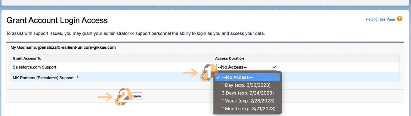 1.3 Within the Grant Account Login Access page, click on the “Down Arrow” next to MK Partners to set an “Access Duration” between 1,3,7,30 days. Once set, click on “Save” to apply and grant our support team access to help troubleshoot your Mambo Merge issue. ↵