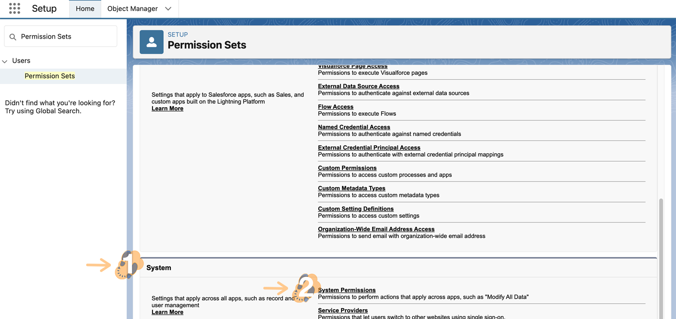 2.2 Within the “Home” tab search “Permissions Sets” and click on its search result.