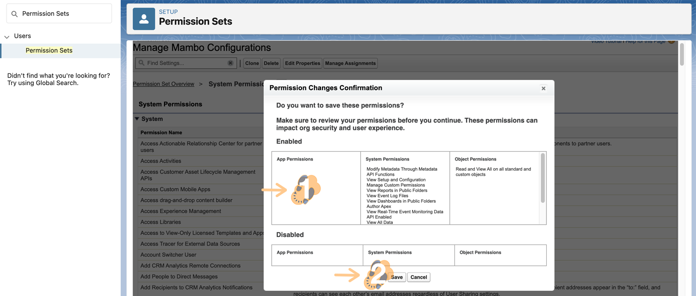 Note: The pop-up may or may not appear. Make sure to head back to the Permission Sets screen to make sure the changes were successfully saved.
