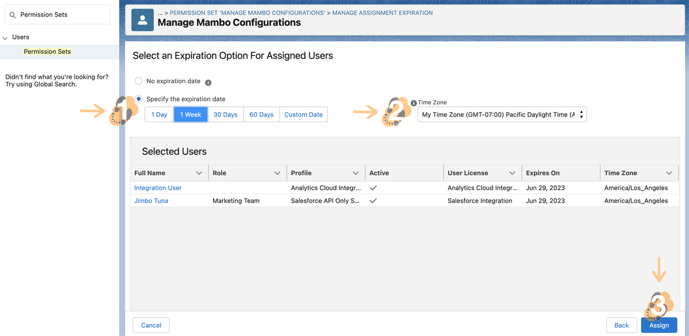 4.4 On this last screen, you have the option to “set an expiration date” for this permission set. By default, there is none assigned. Once ready, click on “Assign” to save.