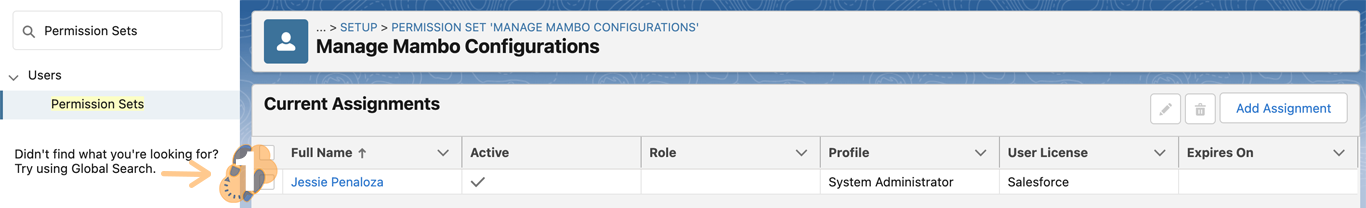 4.6 When successful, the “Current Assignments” window will now list all the users that have been assigned to this permission set.