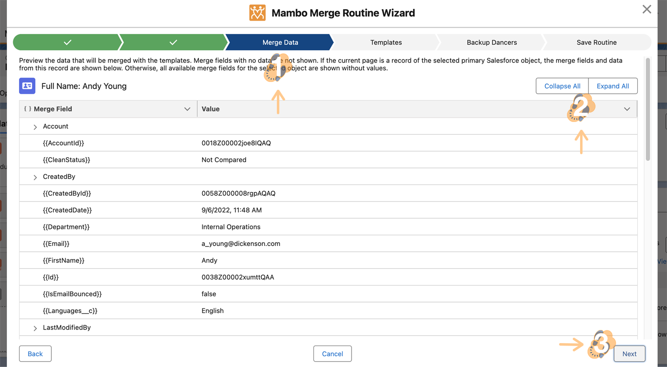 Note: Use the Collapse All and Expand All buttons to traverse available fields and verify merge syntax used will return the data or values you need.