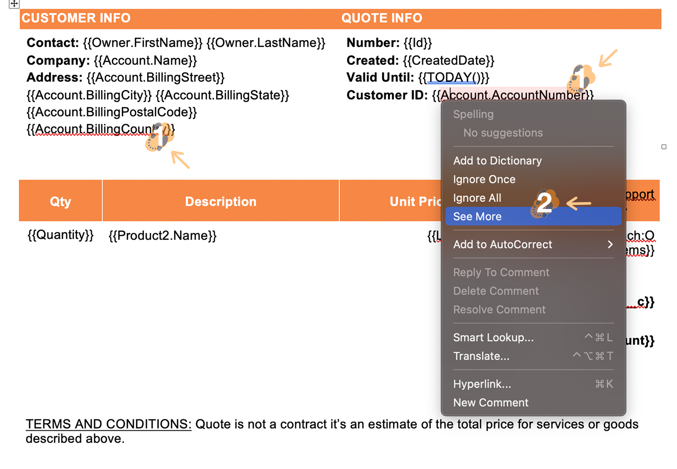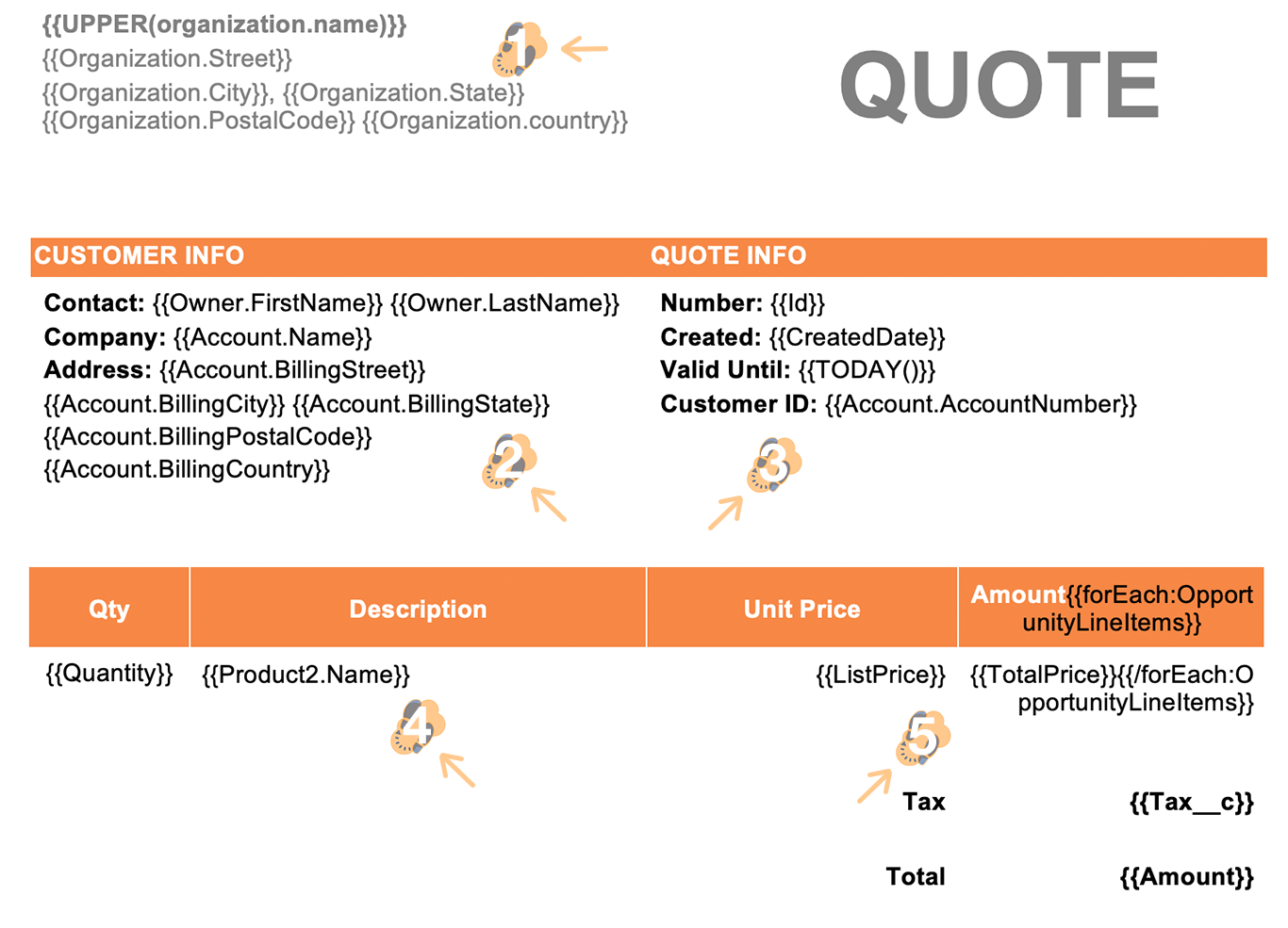 3.1 We’re creating a basic quote template that pulls information from an opportunity record. The merge syntax, which is surrounded by “double curly brace notation” and includes the merge field name, is used to identify the data you need to merge into that document.