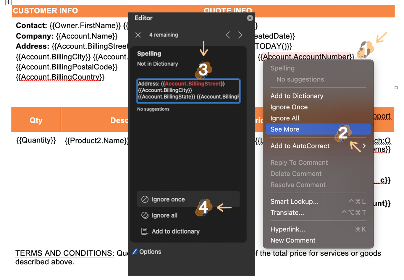3.2 As you begin to build the template you may notice “red squiggly lines” below each merge field syntax. We recommend you ignore each one as the document editing software will not recognize the merge field syntax.