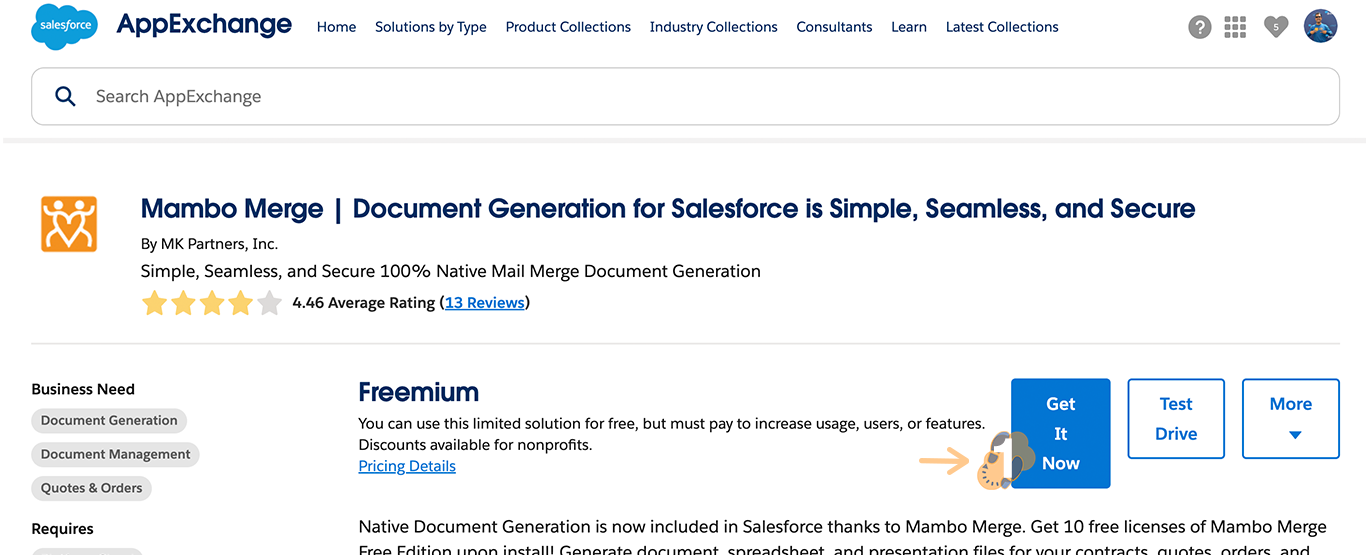 1.2 The install link will redirect you to the Mambo Merge AppExchange download page, go ahead and click on the “Get It Now” button to begin the process.