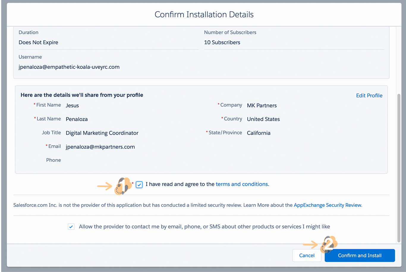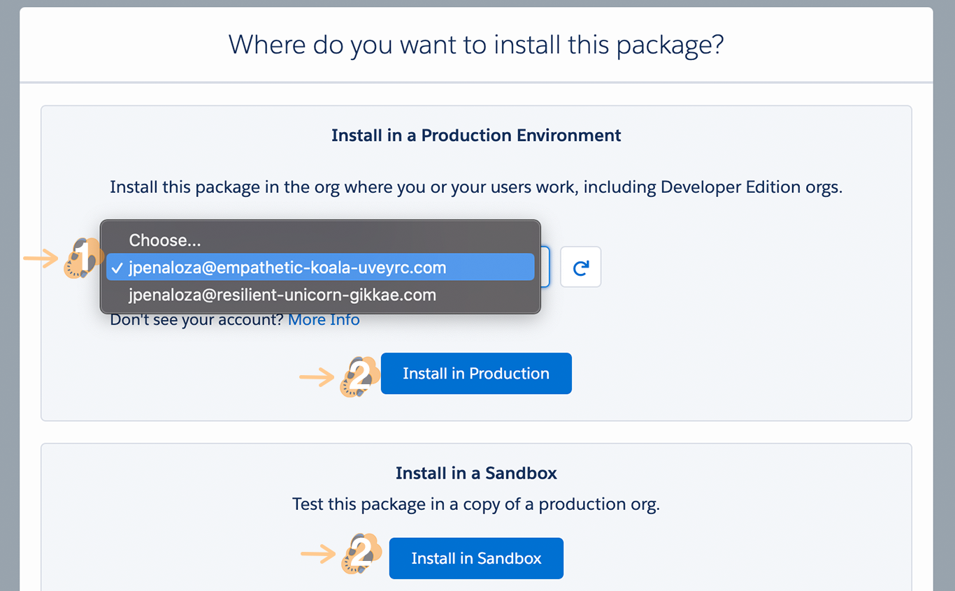 2.1 A window will now appear asking you to choose the *“account” *to use for the installation. Next, select either “Install in Production” or *“Install in Sandbox” *to define the install environment.