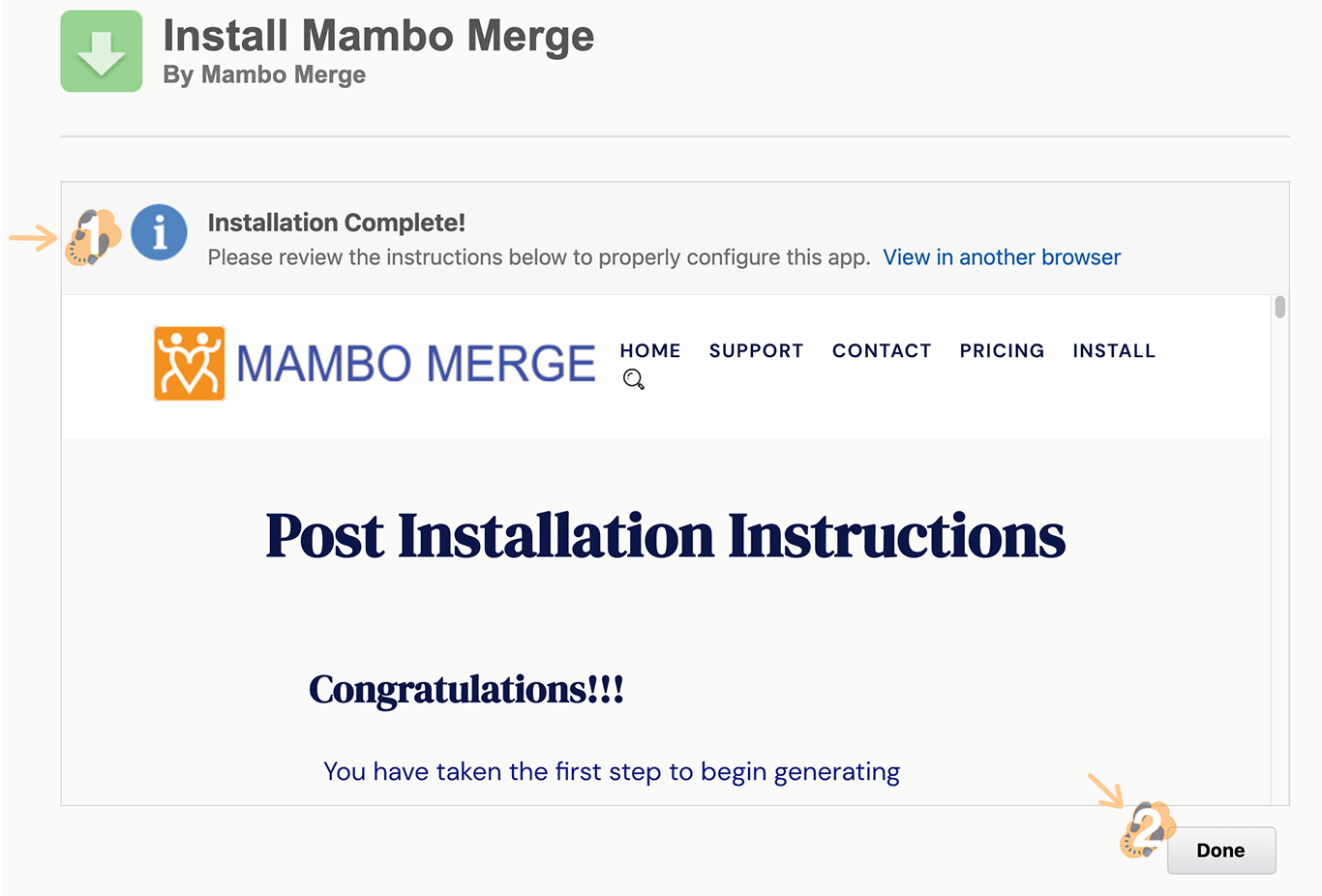4.3 Once the installation is complete you will be prompted with some “Post Installation Instructions” to help you get started using the app. Press “Done” to close out the window and take you back to your org.