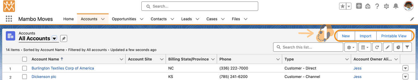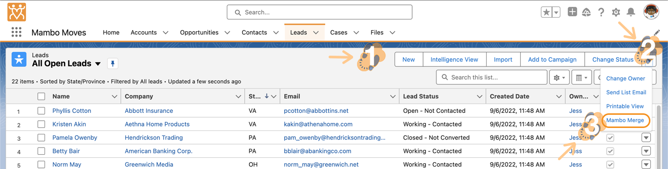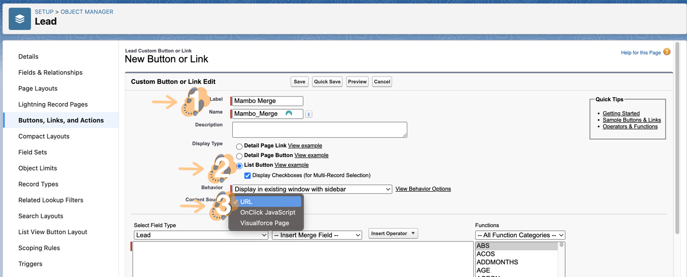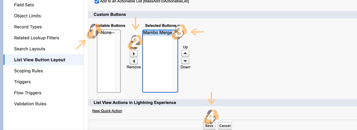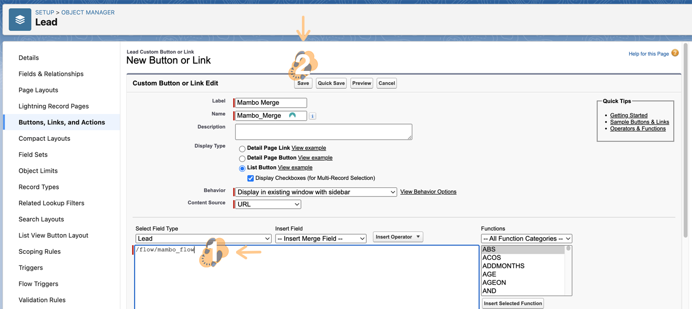 4.9 Head back to the “Object’s List View.” In our example, we used the “Leads” locate your button named “Mambo Merge.”