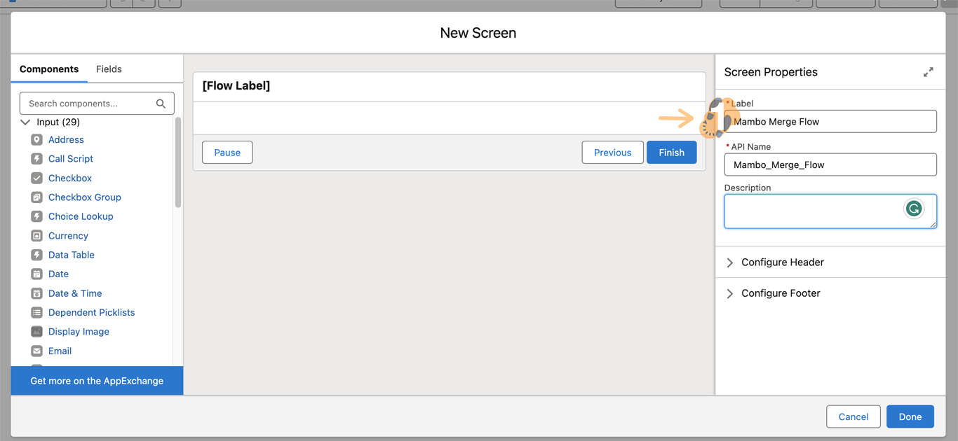 3.5 Continue by labeling your “Screen Element.” For our example, we used “Mambo Merge Flow.”