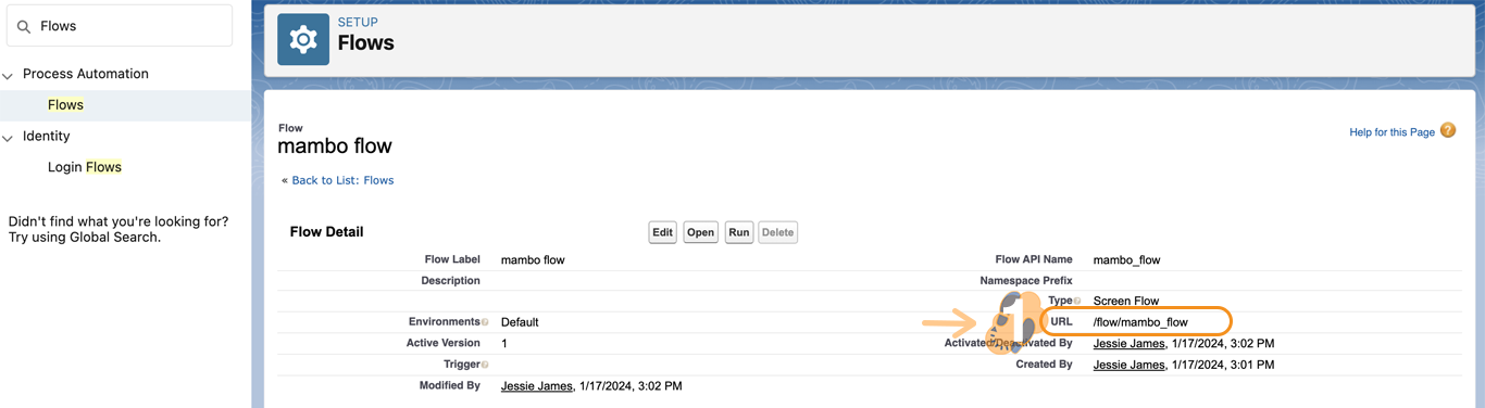 4.5 Locate the “URL” and copy it. In our example, it is called, "/flow/mambo_flow."