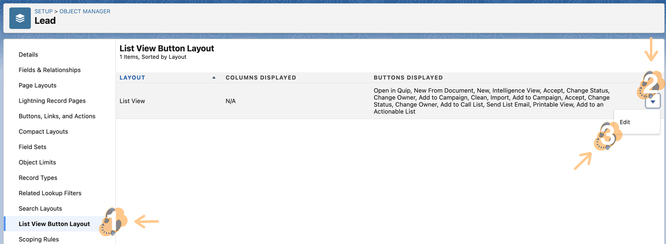 4.7 With the button now created we can add it to the “List View Button Layout” by choosing this option from the nav menu and using the “Down Arrow” to select “Edit.”