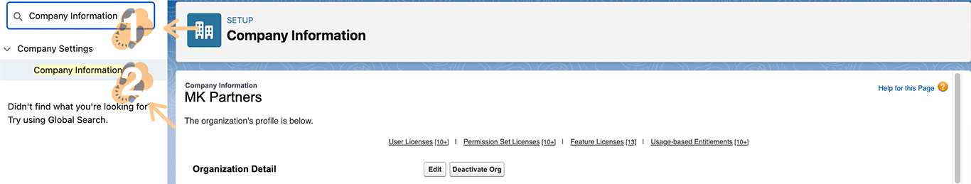 1.2 From the “Home” tab, type “Company Information” into the search field, and then click on the corresponding search result. ↵