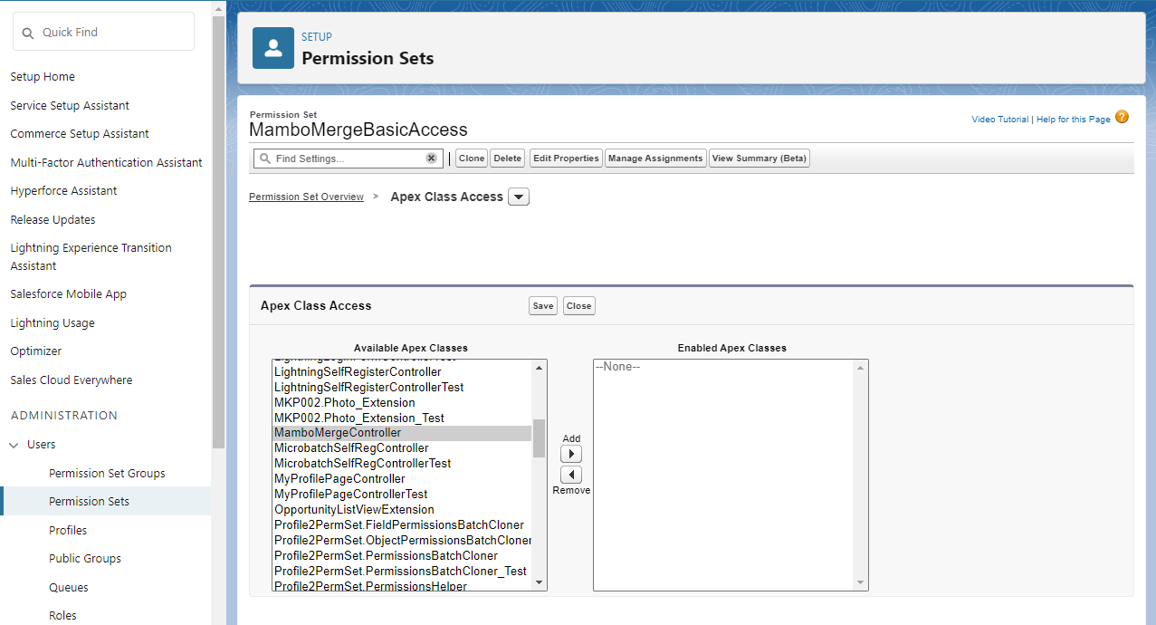 3.3 Look for “MamboMergeController” and add to Enable the Apex Class. Then, click save.