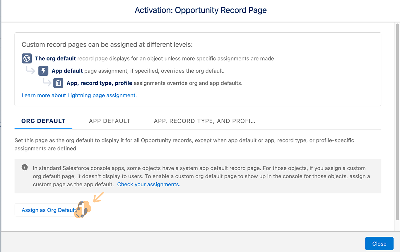1.7 In the activation window, go ahead and click on “Assign as Org Default”.