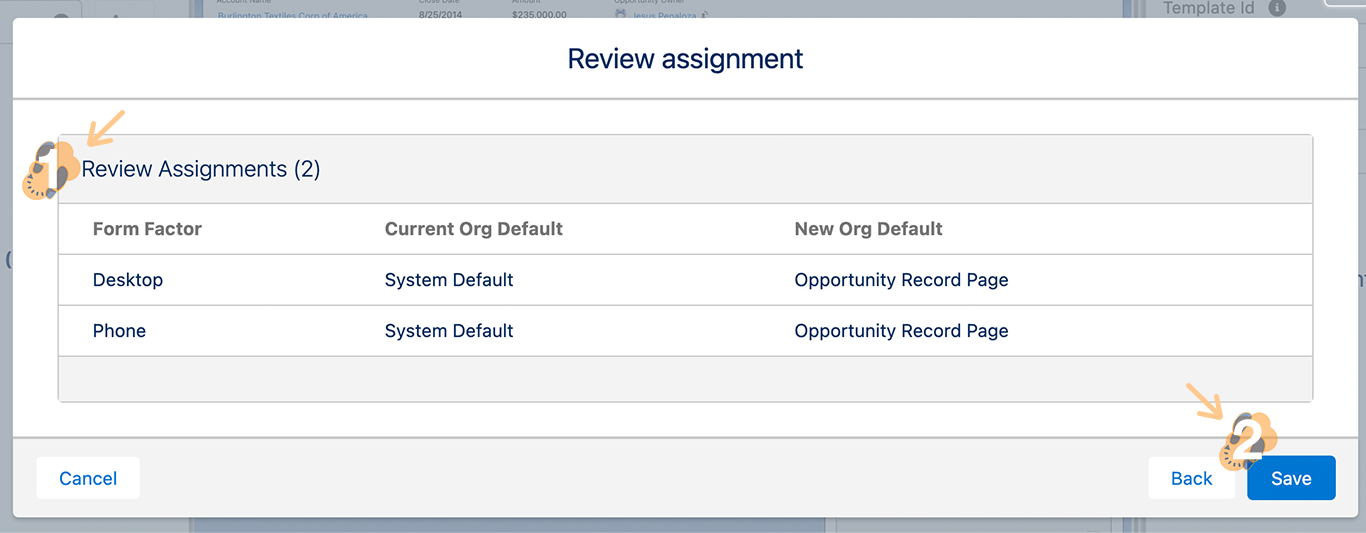 1.9 The last window reviews your changes. Click on “Save” to activate the component. Back on the lightning app builder, click the “Save” and “Back Arrow” buttons to complete this step of the process.