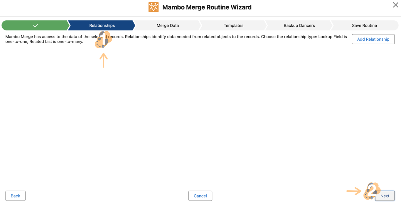 2.6 Next is the Relationships page. Relationships allow you to tell Mambo Merge information you need from related records to your Primary Salesforce Object record. For this routine build, we don’t need to set up Relationships, so click “Next” to skip and proceed.