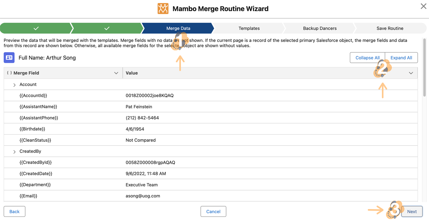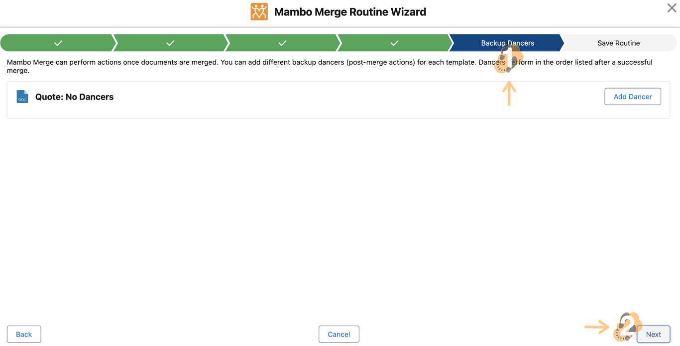Mambo Merge can run some post-merge actions using “Backup Dancers”. These actions include updating record information, saving a task and even sending an email! For this routine, we won’t add any of these actions. Click “Next” to proceed.