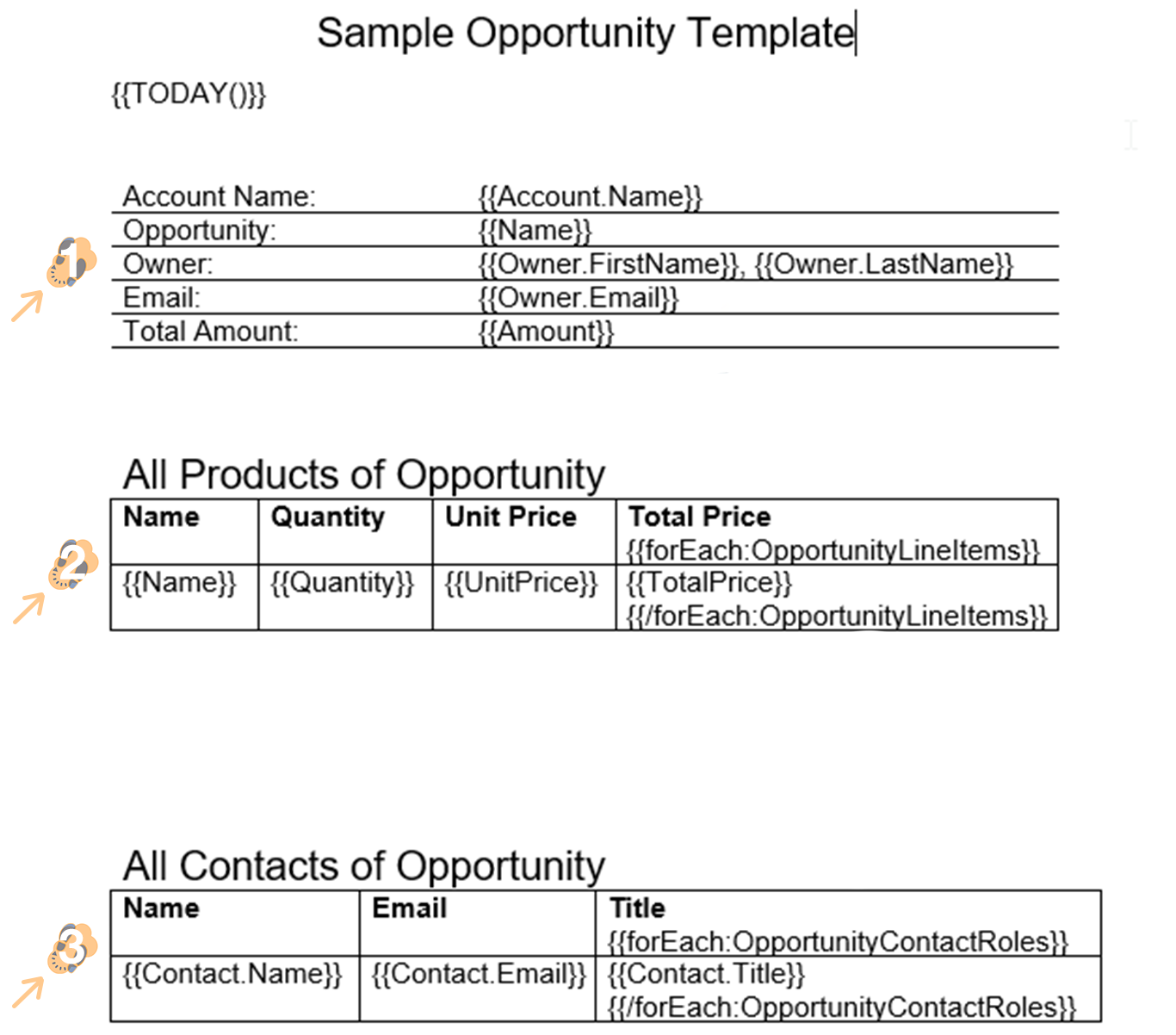 3.3 In our example below we are taking an existing document and adding merge syntax to retrieve opportunity data from an opportunity record. All merge syntax will be identified with the double curly bracket notation along with a field name e.g. {{Merge_Field_Name}}.