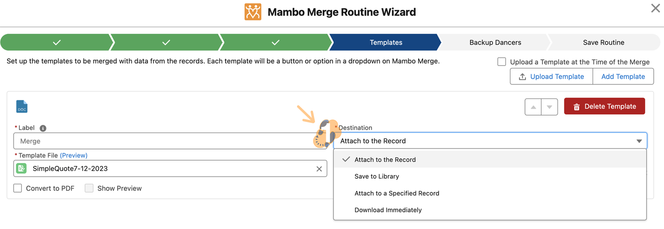 4.3 Next setting is the “Destination” dropdown list, where you decide how your generated document is saved. You can either “Attach to the Record”, “Save to Library”, “Attach to Specific Record” or “Download Immediately”.