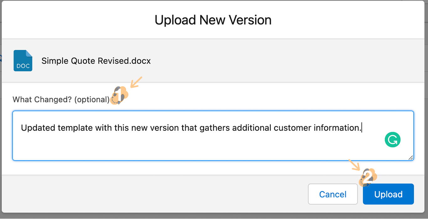 3.4 This next window will now give you a chance to add notes as a reminder for tracking the changes made when revising an existing document within the FILES tab. Continue by pressing “Upload” to replace the existing file with this newer version.